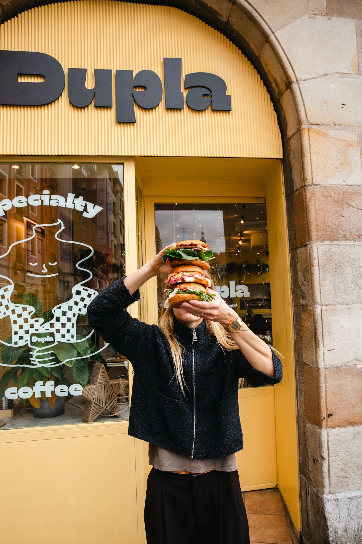 Images for Dupla Specialty Coffee, a café in Bilbao started by four friends from Budapest. Bold imagery to complement their branding. Standout menu items include bagel sandwiches and pastries, along with amazing specialty café drinks like flat whites and matcha lattes.
